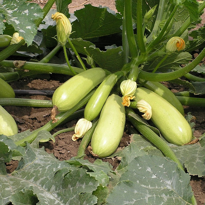 Плоды цилиндрической формы, очень выровненные, длиной 18-20 см. Кожица светло-зеленая, очень нежного оттенка, тонкая. Мякоть белая или кремово-белая, нежная, сочная, с отличным вкусом. Урожайность чрезвычайно высокая — до 17 кг с одного растения при интенсивной агротехнике. Плоды сохраняют вкусовые качества при замораживании, а вызревшие кабачки могут храниться до 6 месяцев.