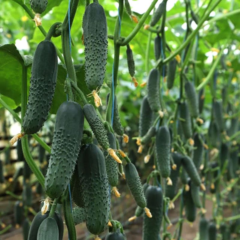Плоды однородные, крупнобугорчатые, длиной 12-14 см, насыщенного темно-зеленого цвета. Мякоть плотная, хрустящая, генетически без горечи. В каждой пазухе формируется по 3-5 плодов. Гибрид демонстрирует высокую завязываемость даже в стрессовых условиях, отличную транспортабельность и лежкость плодов. Предназначен для выращивания в пленочных теплицах в первом и втором оборотах.