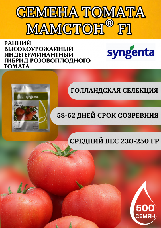 Мамстон F1 – это ранний высокоурожайный индетерминантный гибрид розовоплодного томата, созданный нидерландской компанией Syngenta Seeds. Идеален для теплиц и укрывных конструкций любого типа, обеспечивает ранний урожай весной и летом, подходит для первого и второго оборота.